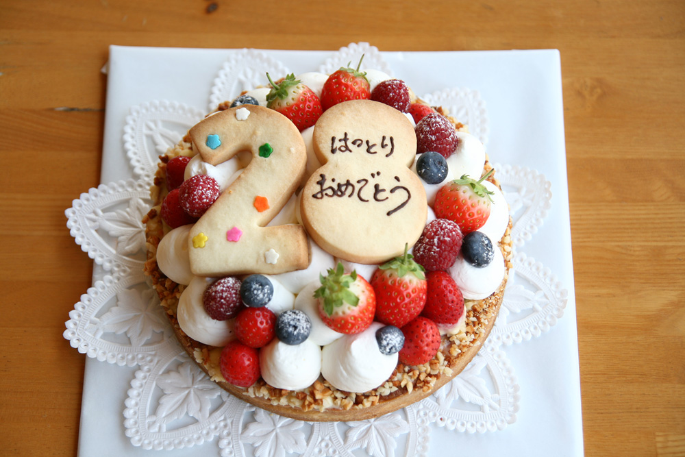 フルーツタルトのバースデーケーキです。 大人の方なら、やっぱりタルトがおすすめです。 こどもさんには、やわらかいスポンジケーキがいいのかな。