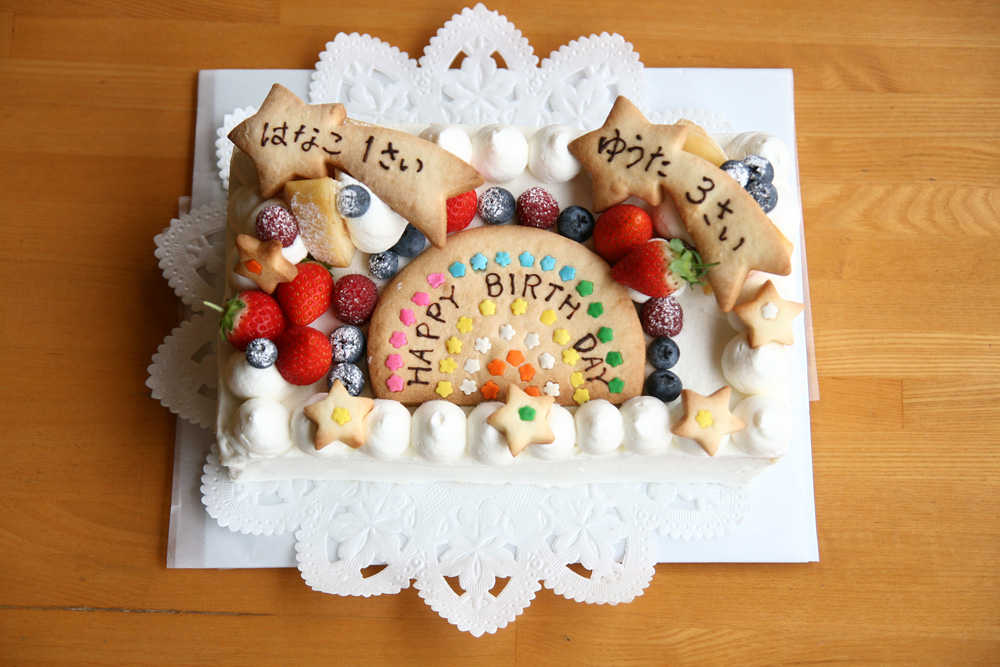2009/9/24 1さいと3さいのケーキ 1歳になるはなこちゃんと3歳になるゆうたくんのバースデーケーキです。 ベリーが大好きなゆうたくんのために、ベリーをたくさんのせました。 また、お父さんとのケーキもあるから楽しみにしててね。 Tweet