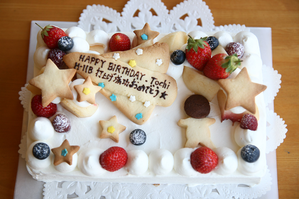 ロケットを作っているという旦那さんに贈るケーキです。 宇宙がテーマのケーキです。 たくさんのフルーツで飾り付けしました。