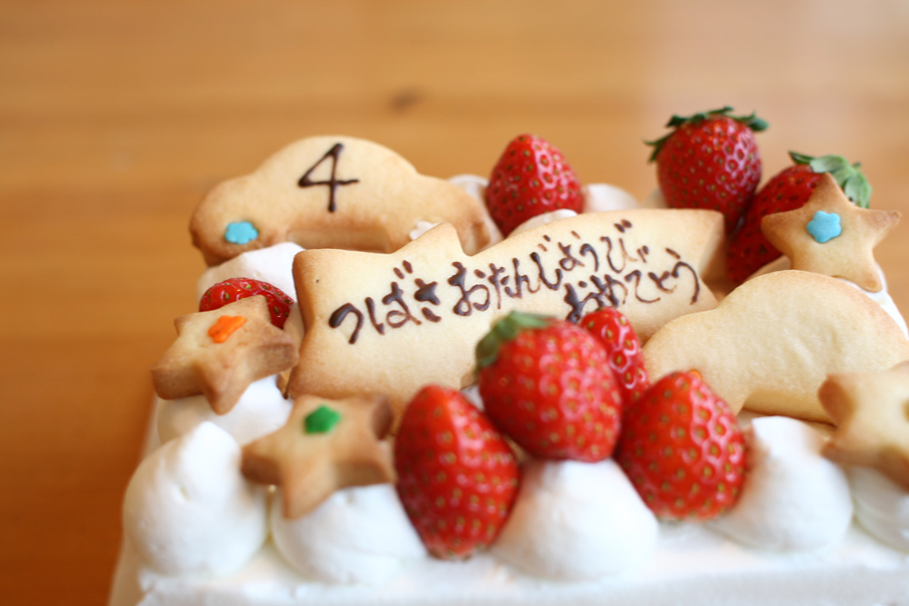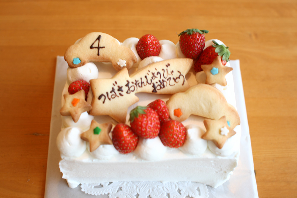 4歳になる男の子のバースデーケーキです。 スポンジケーキの一番小さいサイズです。 つばさくんとても元気でかわいかったです。