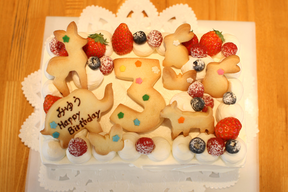 動物をたくさんのせた、3歳になる女の子のケーキです。