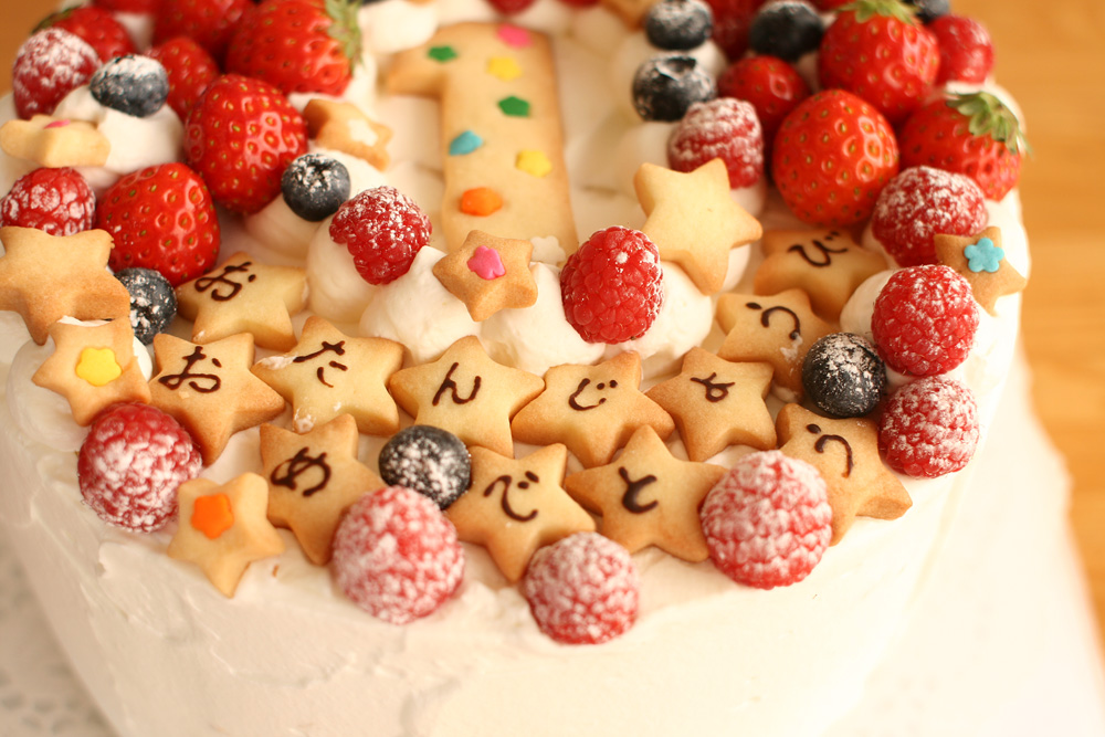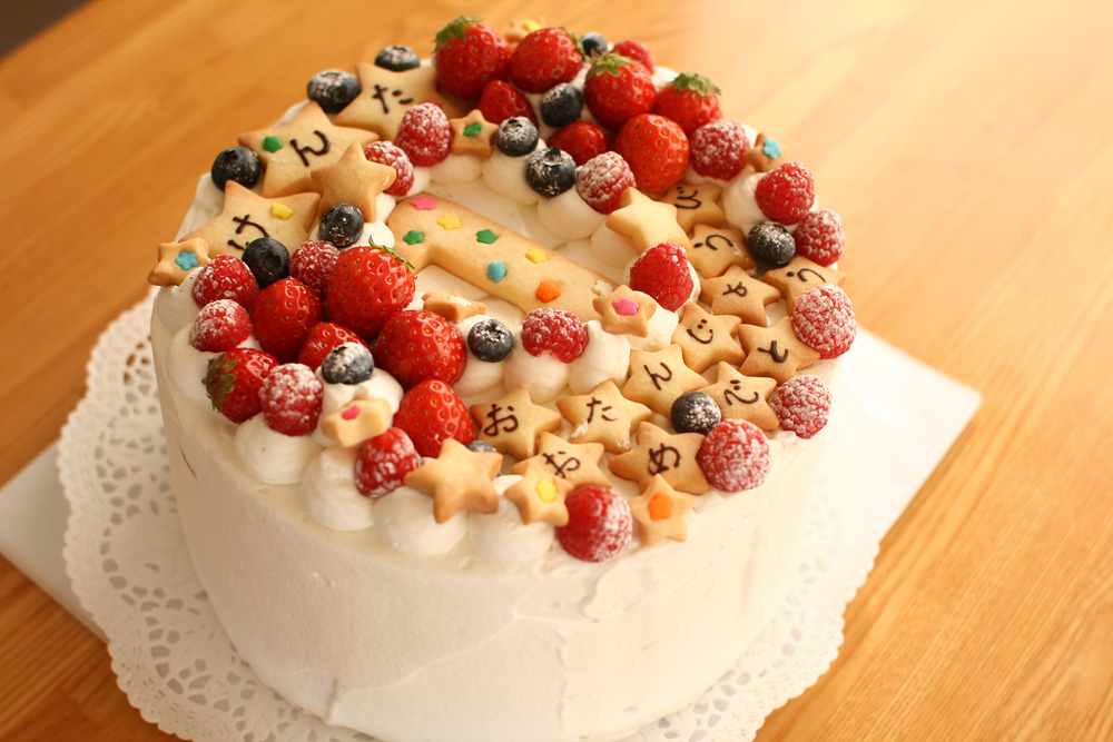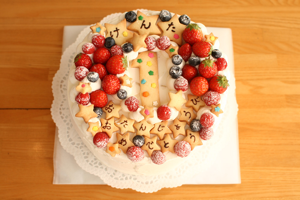お友達を呼んでパーティーをするとのことで、大きいシフォンケーキをベースに、クッキーとフルーツをたくさん
