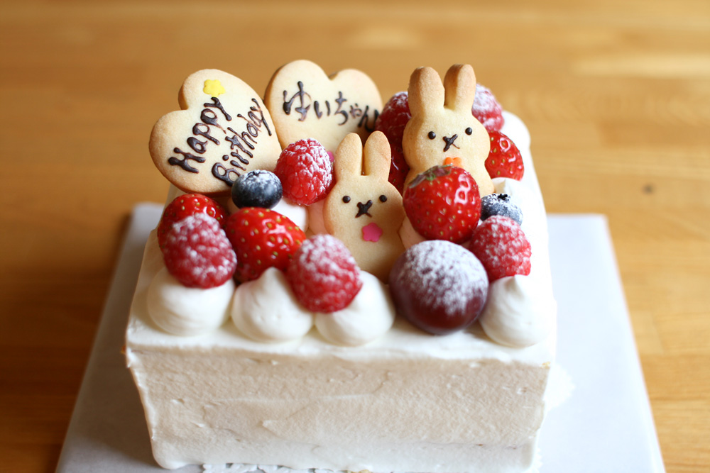 ウサギとベリーが好きな女の子におくる小さなサイズのスポンジケーキです。