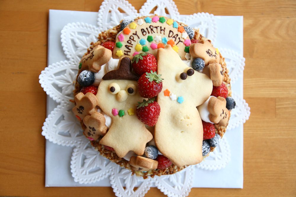 17センチのフルーツタルトに、生クリームを少なめにして、クッキーをたくさんのせました。 オリジナルの虹のクッキーにメッセージをかきました。