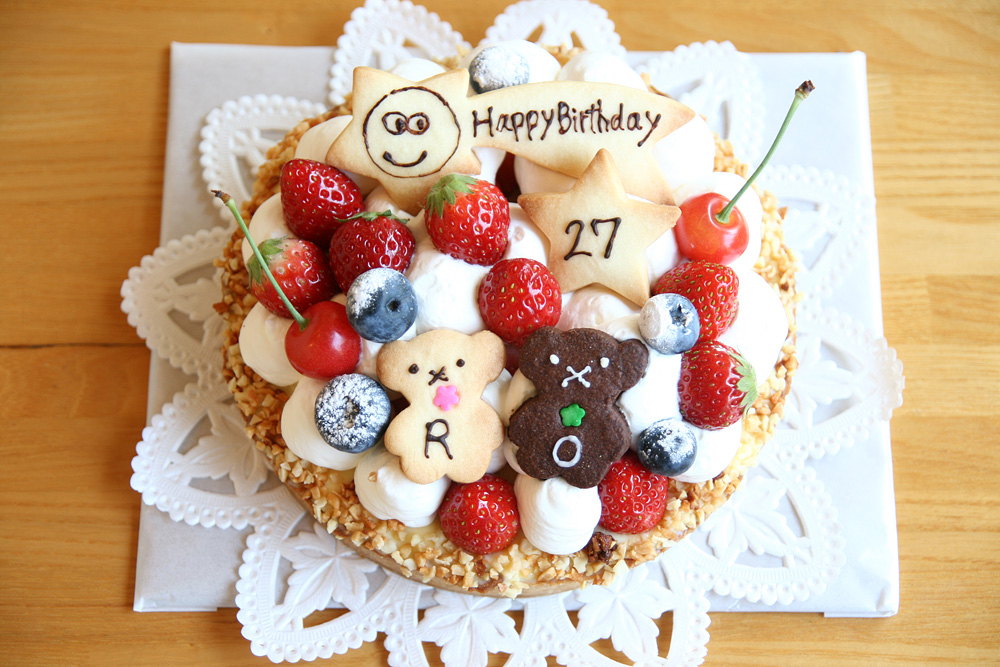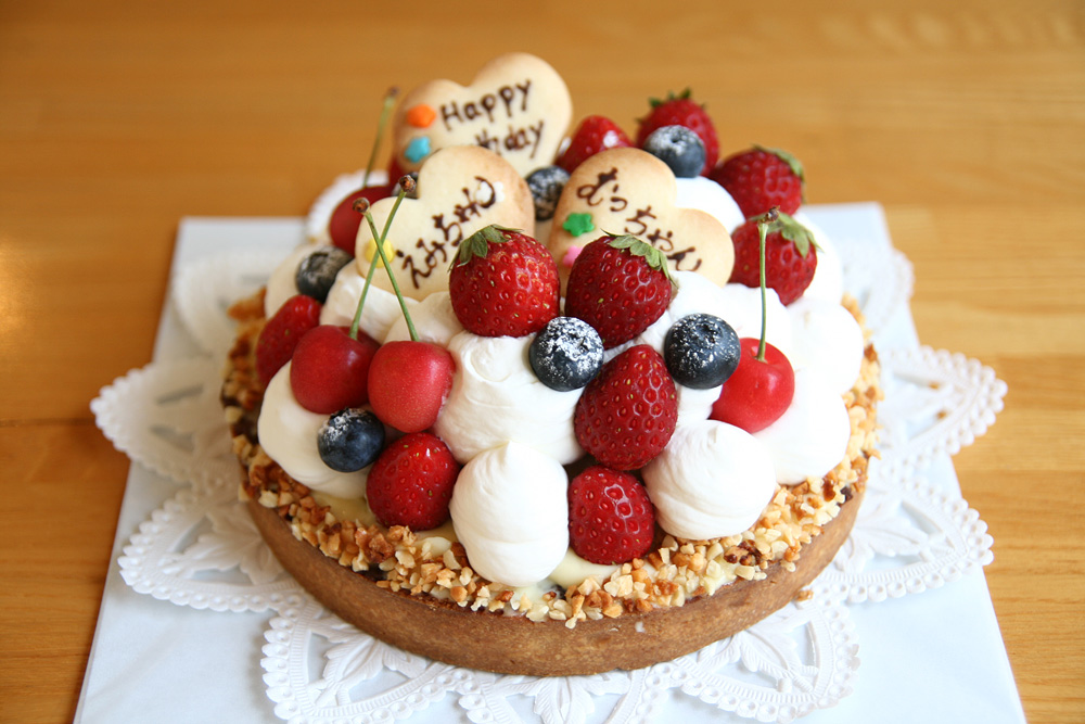 17センチのフルーツタルトがベースのバーデーケーキです。 デザインはお客様がしてくださいました。