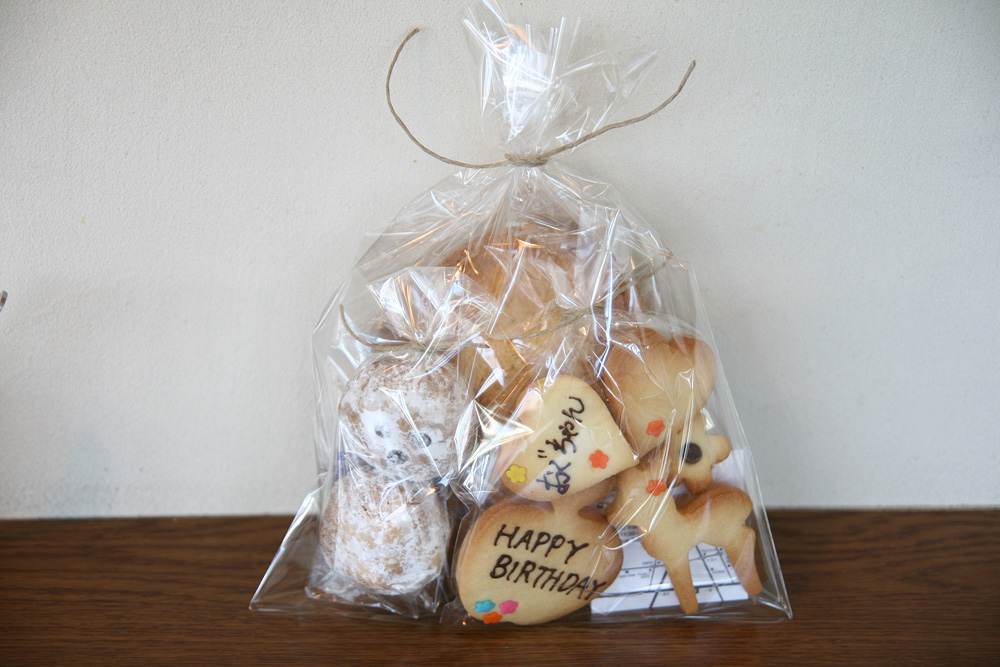 お友達のお誕生日に贈る、メッセージクッキーと焼き菓子の詰め合わせです。