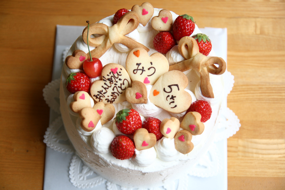 シフォンケーキをベースにした、リボンとハートでとてもかわいいケーキです。