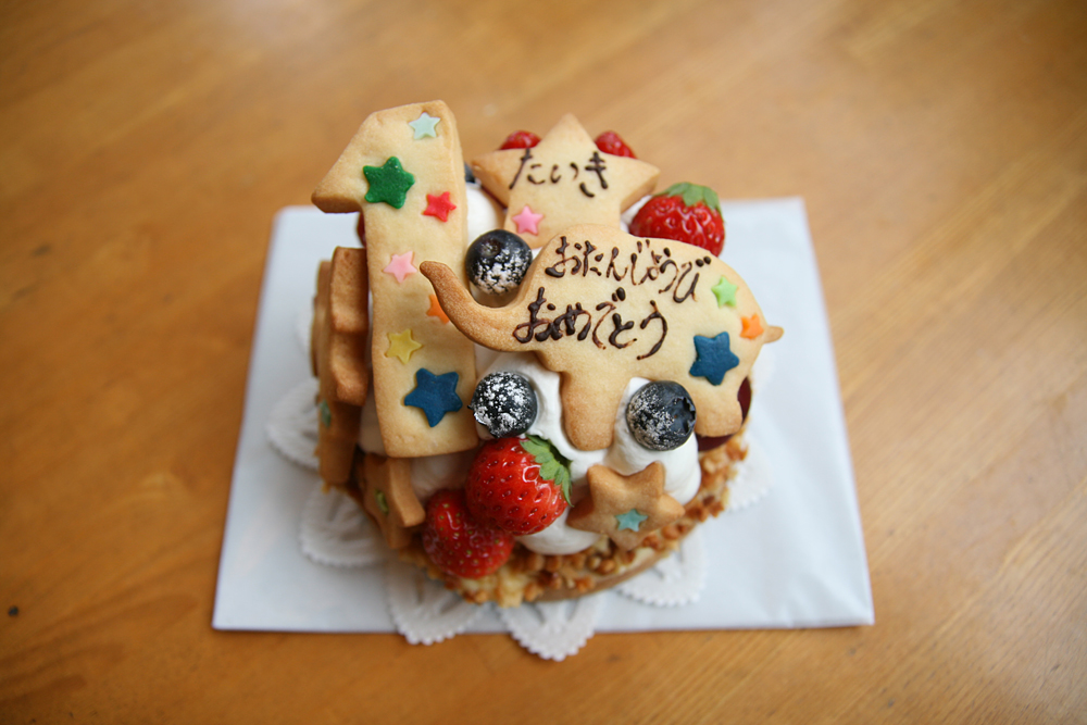 パパとママと3人で食べる12センチのタルトのバースデーケーキです。
