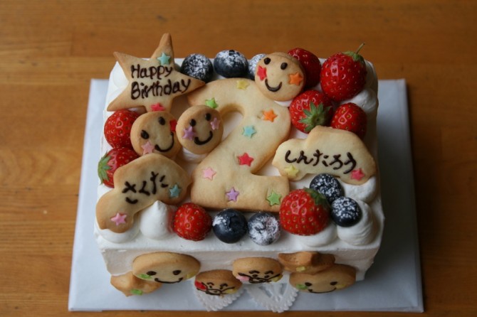 2歳の2人のお誕生日ケーキです。 まだ2歳なので、2歳らしい可愛いケーキにしました。 4歳のお兄ちゃんはバイク好きとのことでバイクをのせました。