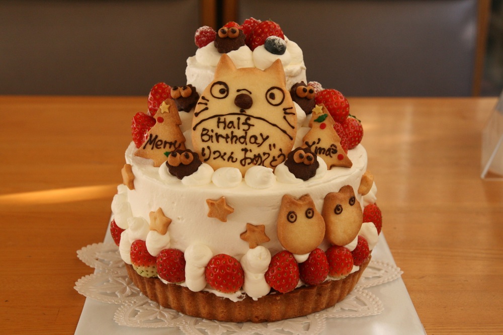 クリスマスの後に、お誕生日とクリスマスを祝うケーキです。