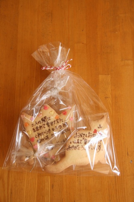 お母さんに贈るというケーキです。 猫ちゃんの肉球つけました。 もうすぐ結婚するとのことで、両親に感謝のメッセージを添えました。