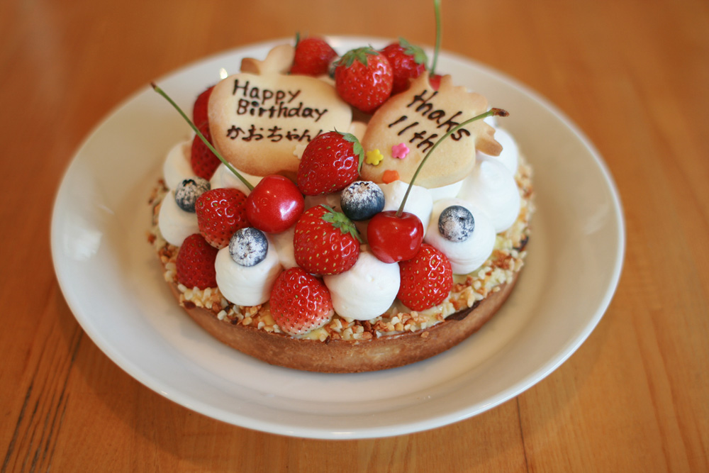 フルーツタルトのバースデーケーキです。 お客さまからのテーマが”フルーツ”だったのでクッキーのプレートもフルーツにしました。