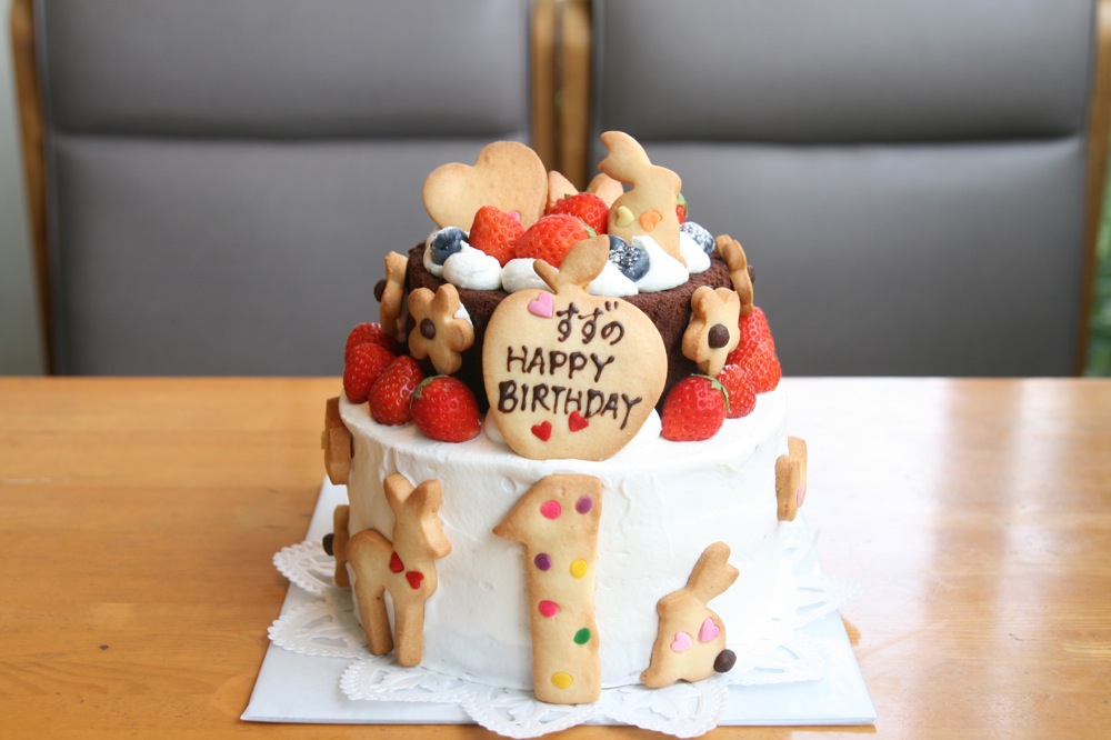 フルーツをメインにデコレージョンしました。 1歳のお誕生日ケーキです。 上はチョコケーキになっています。 雨、大丈夫で安心しました。