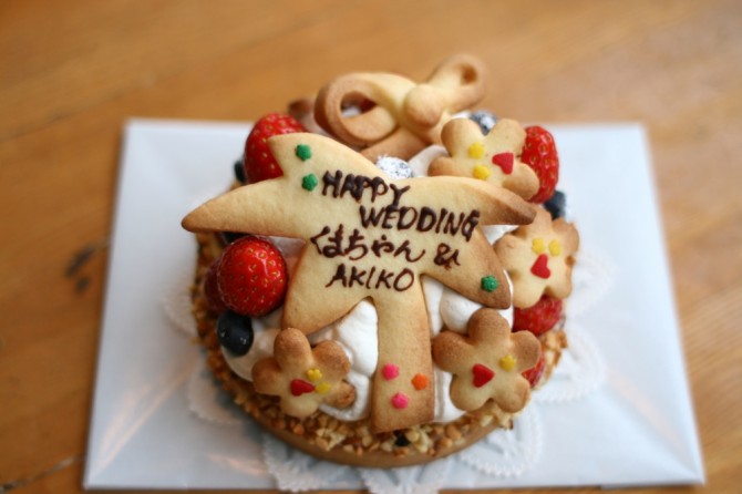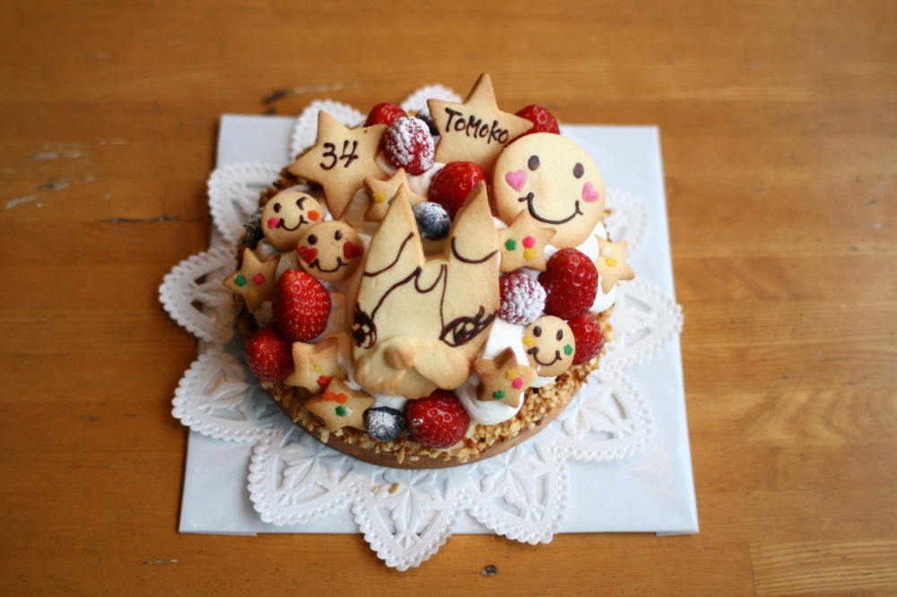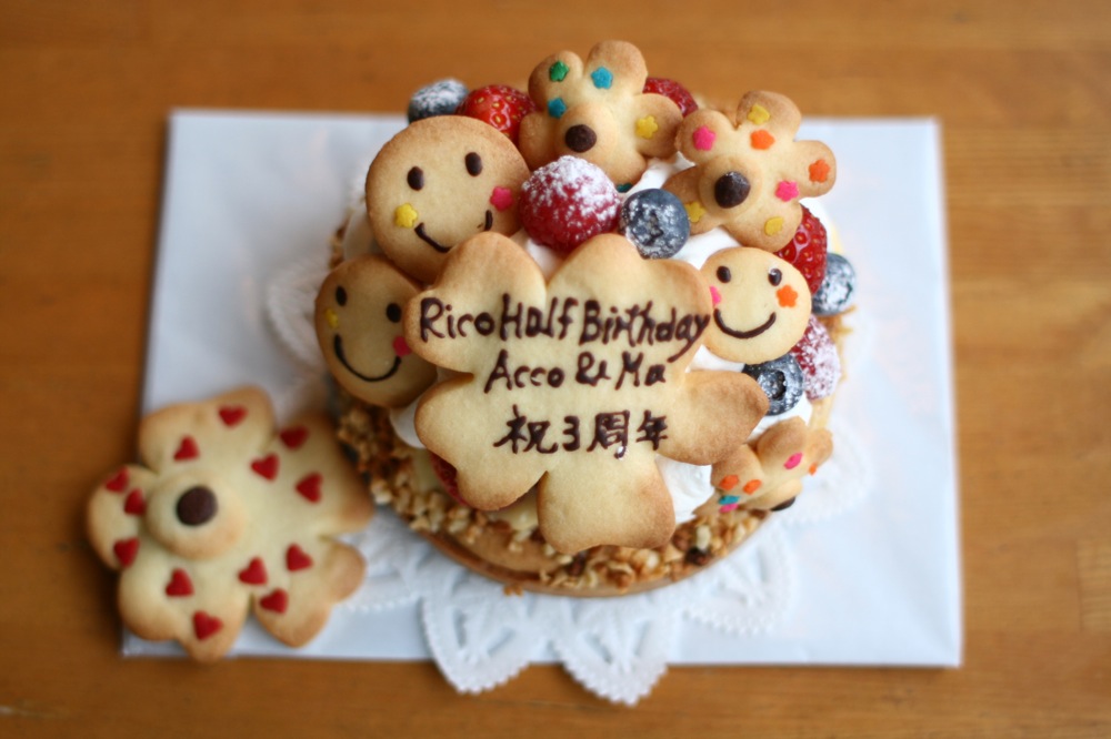 娘さんとパパママを祝うケーキです。 カラフルなしでシンプルに。 ハワイをイメージしました。 お友達の好きなブランドのマークをいれました。