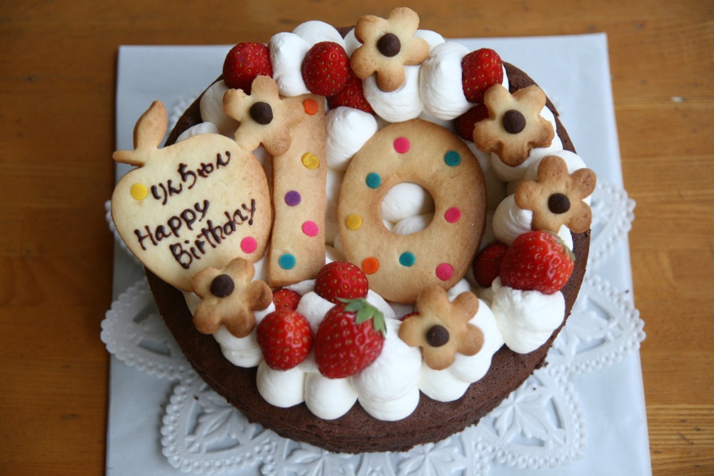 生クリームたくさんデコレーションして、チョコケーキをベースにしたケーキです。