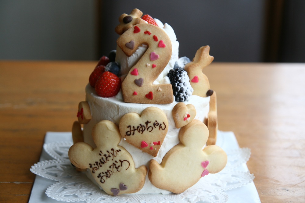 いつも抱っこしているぬいぐるみをつけたケーキです。